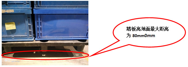 1、現(xiàn)階段人工手動叉車叉起踏板距離地面的極限距離為80mm,如下圖: